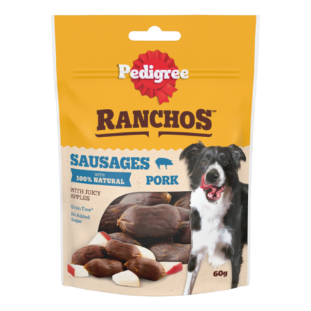 Your furry friend deserves the best: Pedigree® Ranchos™ Sausages Dog Treats are packed with natural goodness, including 100% natural Pork and juicy Apples. These cracking sausages are made without grains and added sugar, so that dogs can enjoy them everyday.