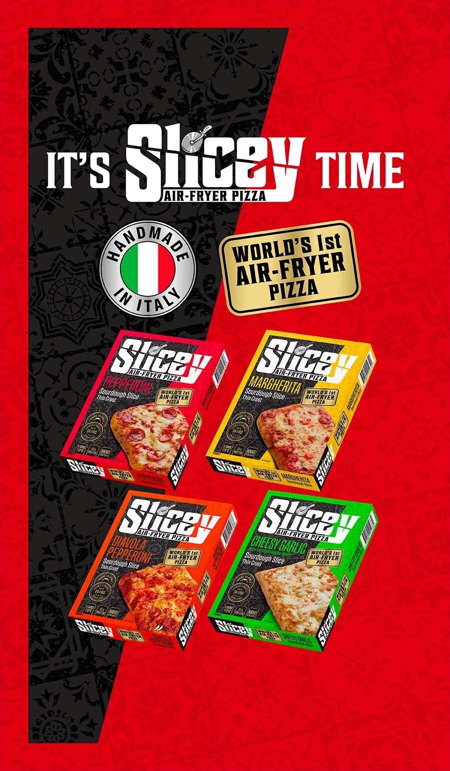 Slicey Pizza is a handmade Italian sourdough pizza slice that is ready from your air fryer in just 6 minutes. Each slice delivers up to 14g protein and weighs in at 440calories. The sourdough base is fermented at two different tempertaures to ensure a perfect cook in the air fryer.