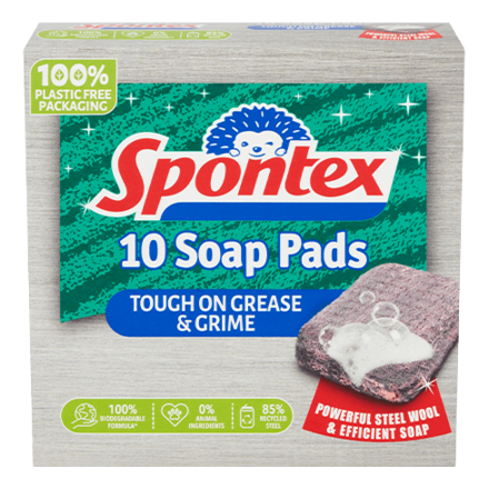 Spontex Soap Pads are made with 85% recycled steel and filled with a 100% biodegradable soap* made with sustainably sourced oil that's free from animal ingredients and hazardous preservatives and is not tested on animals. As part of their commitment to switch to more sustainable packaging, Spontex no longer use a plastic punnet or non recyclable foil lid on this product. They've moved to a 100% recyclable cardboard box that contains at least 75% recycled content and is made with materials from sustainably managed forests. They are using 1,440kg less plastic and 160kg less foil for every 100,000 packs and they can fit 30% more packs in a truck which means less trucks on the roads each year. This compact format also takes up less space at home and once opened the robust upright box is perfect for storing any unused pads.