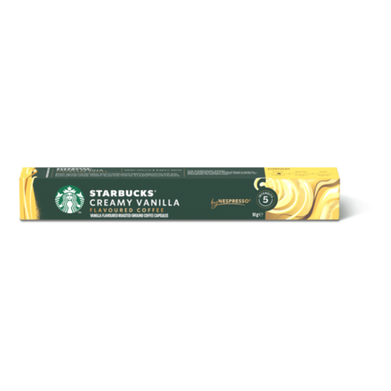 Sit back and savour this Starbucks® Blonde roasted coffee flavoured with creamy vanilla and biscuit notes. Enjoy with or without milk for a sweet and delightful cup. We use the same high quality 100% Arabica beans as our coffeehouses. Make your Starbucks® Creamy Vanilla Flavoured Coffee by Nespresso® at home with these capsules, compatible with Nespresso® coffee machines. STARBUCKS® by NESPRESSO® are aluminium coffee capsules compatible with NESPRESSO® coffee machines.
