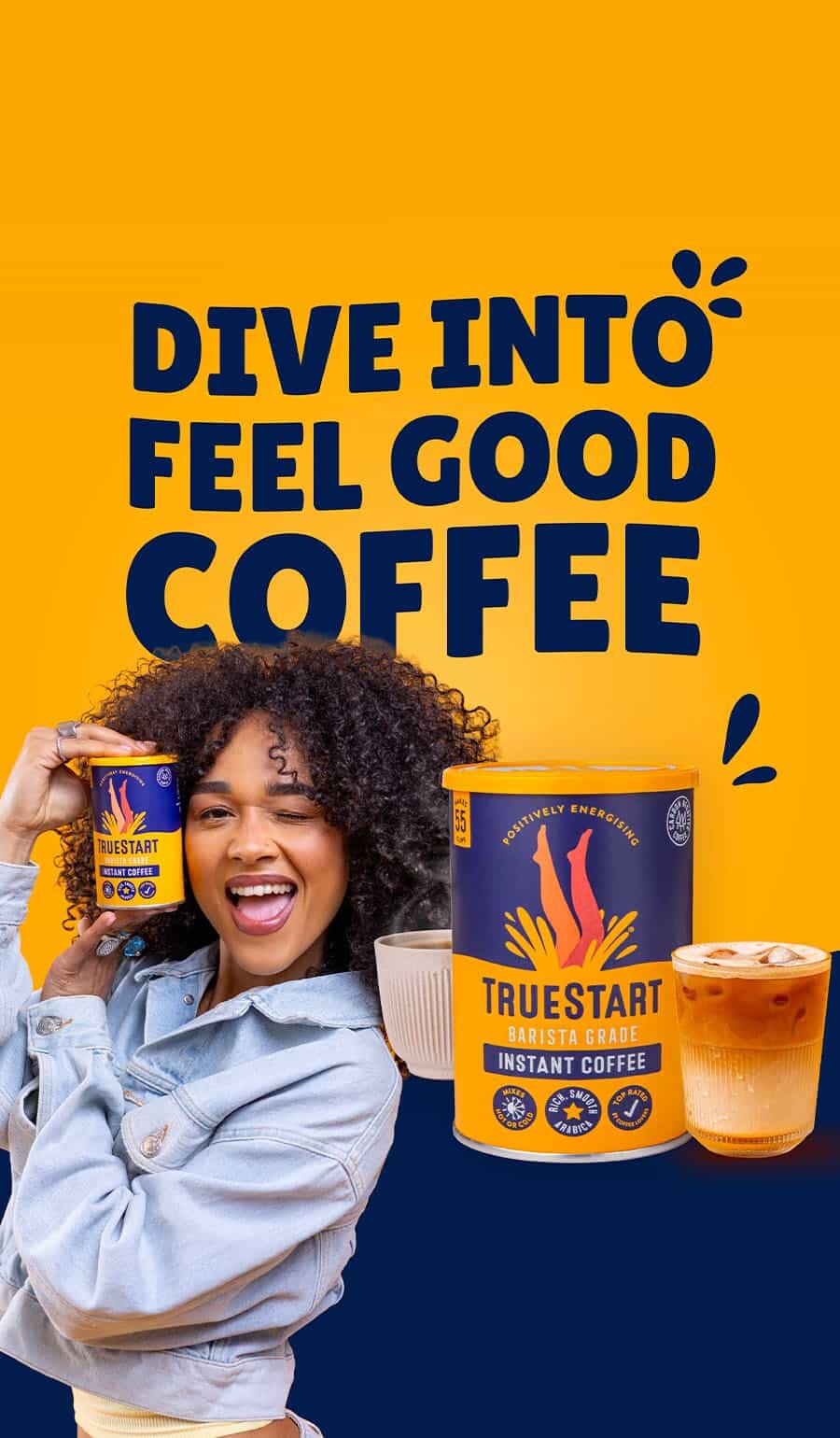 Dive into TrueStart's delicious, healthier instant coffee. Every cup of TrueStart is made with speciality grade beans, tested for quality and B Corp certified. Tastes amazing black or white, hot or cold - enjoy!