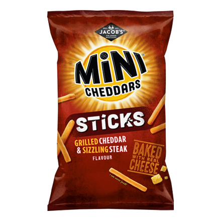 Our new nibbly Mini Cheddars Sticks are crunchy and moreish. Baked with real cheese and full of bold flavour, these sticks are perfect to share with family and friends to make more joyful moments together. Available in two flavours, Rich & Tangy Cheddar Flavour and Grilled Cheddar & Sizzling Steak.